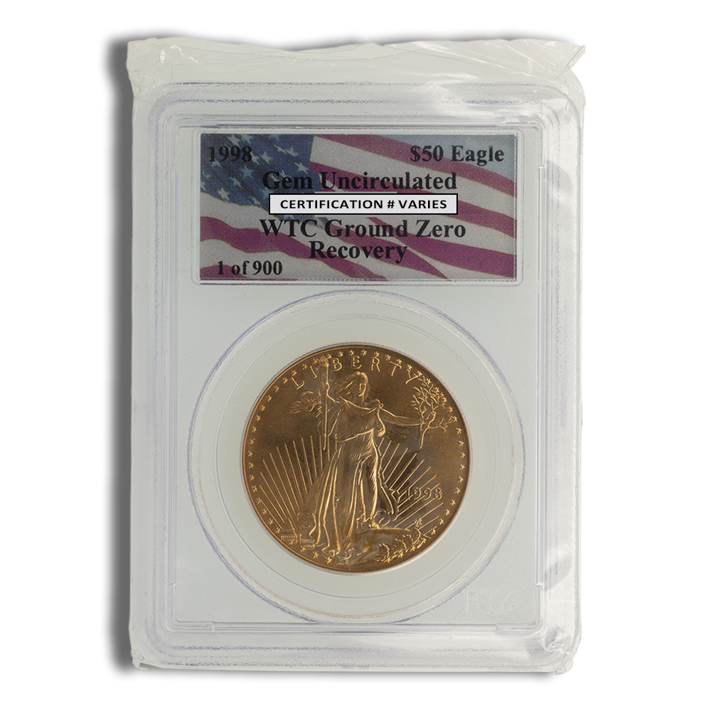 1998 1 oz Gold Eagle $50 PCGS Gem BU – WTC Ground Zero